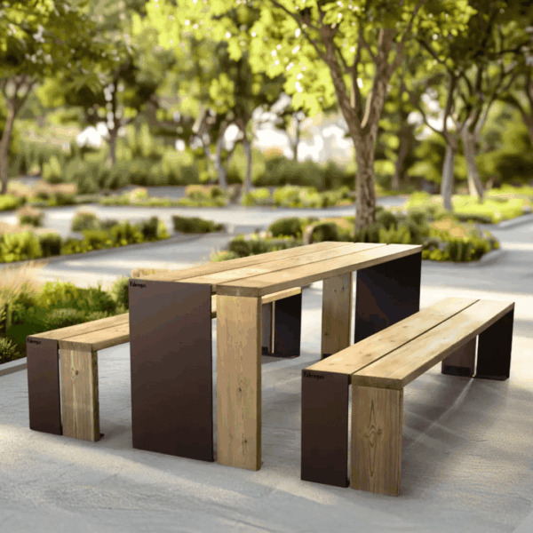 Banco de piquenique Tauló, com dimensões de 2008 x 390 x 450 mm. Combina elegância e sustentabilidade, sendo ideal para espaços exteriores e urbanos.