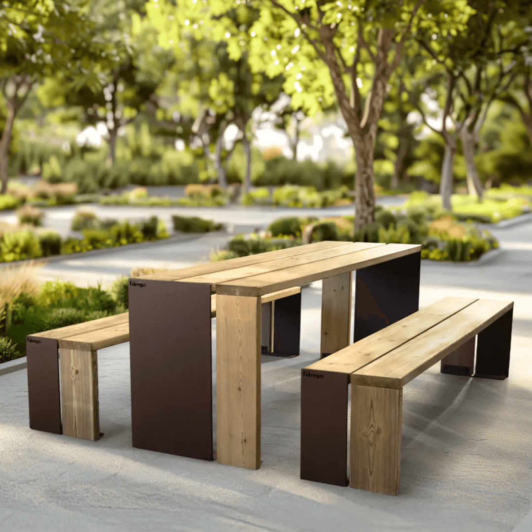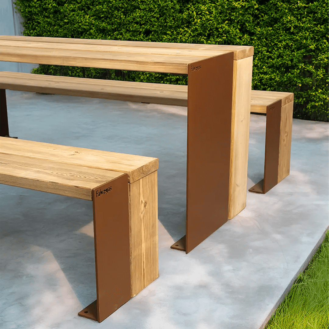 • Estrutura Robusta: Suportes em aço com acabamento em cor corten, proporcionando resistência e durabilidade.
